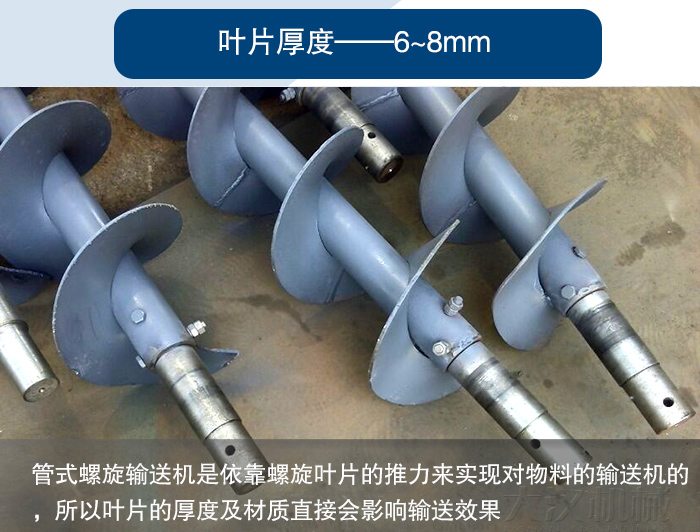 管式螺旋輸送機(jī)是依靠螺旋葉片的推力來實(shí)現(xiàn)對(duì)物料的輸送機(jī)的,所以葉片的厚度及材質(zhì)直接會(huì)影響輸送效果,葉片厚度一般在6~8mm左右,也可以根據(jù)物料的耐磨程度來加厚,這些直接與設(shè)備的使用壽命掛鉤的,所以用戶在選型時(shí)要特別注意這一點(diǎn)。