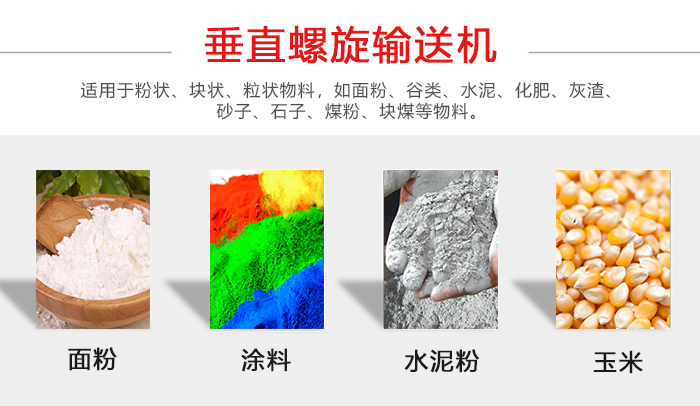 垂直螺旋輸送機(jī)適用于粉狀、塊狀、粒狀物料,如面粉、谷類、水泥、化肥、灰渣、砂子、石子、煤粉、塊煤等物料。同時(shí)還可用于建材、冶金、化工、采掘、機(jī)械制造、煤灰、糧食、食品、等行業(yè)。