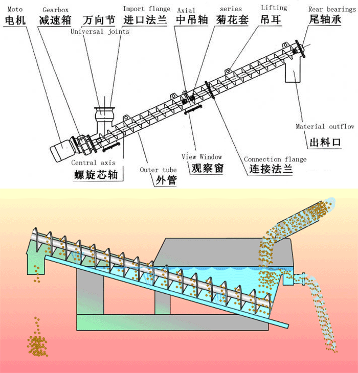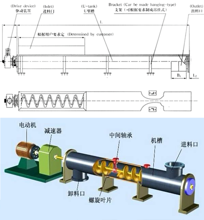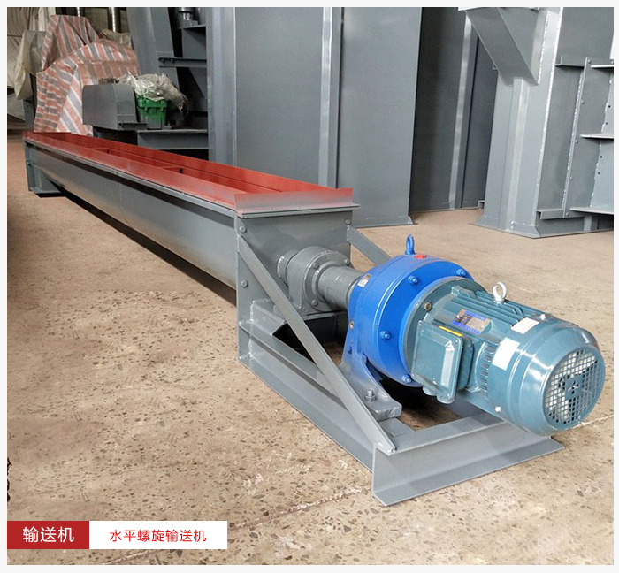 水平螺旋輸送機(jī)是將物料均勻地喂送到下道工序中,在驅(qū)動(dòng)裝置中電動(dòng)機(jī)帶動(dòng)減速機(jī),再由聯(lián)軸器傳遞給螺旋軸當(dāng)物料從進(jìn)料口進(jìn)去后,在螺旋葉片的作用下將物料均勻輸出。