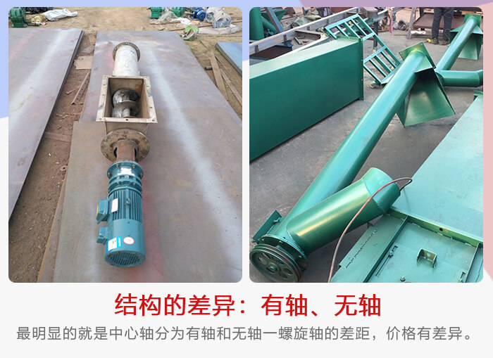 移動式螺旋輸送機在結(jié)構(gòu)特點上其是有所差距的。其中最明顯的就是中心軸分為有軸和無軸,雖然他們就只有一螺旋軸的差距,但是價格還是有幾百甚至上千元的差異,具體差異要以型號差異為主。