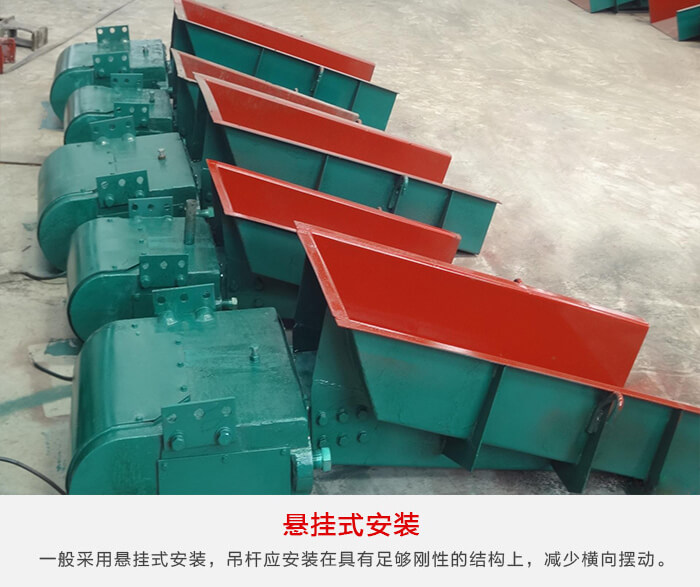 電磁振動給料機一般采用懸掛式安裝,吊桿應(yīng)安裝在具有足夠剛性的結(jié)構(gòu)上, 為了減少電磁振動給料機的橫向擺動, 懸掛吊桿應(yīng)向外張開 10°左右布置。對于大型給料機, 為了維修和更換料槽方便,還應(yīng)設(shè)置移動滑架。