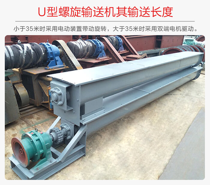 U型螺旋輸送機(jī)的輸送長(zhǎng)的有兩種,其一:殼體長(zhǎng)度小于35m的其螺旋軸是采用一端單電動(dòng)裝置帶動(dòng)主軸的旋轉(zhuǎn),而當(dāng)其長(zhǎng)度大于35m時(shí)就可采用兩端雙電動(dòng)裝置帶動(dòng)主軸旋轉(zhuǎn)。