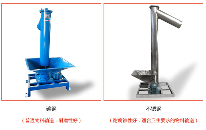 垂直螺旋輸送機(jī)材質(zhì)有碳鋼和不銹鋼兩類,碳鋼適合普通物料輸送,耐磨性好;不銹鋼適合醫(yī)藥,食品,化工行業(yè)的大豆,藥品,化工粉末等物料的輸送,耐腐蝕性好,不易生銹,干凈衛(wèi)生;不銹鋼價(jià)格比碳鋼高出500-3000元左右。