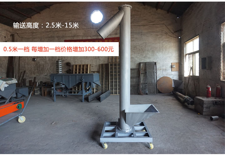 垂直螺旋輸送機(jī)的輸送高度在2.5米-15米;每0.5米為一檔,每增加一檔,價(jià)格增加300-600元,大家可根據(jù)需要選擇高度。