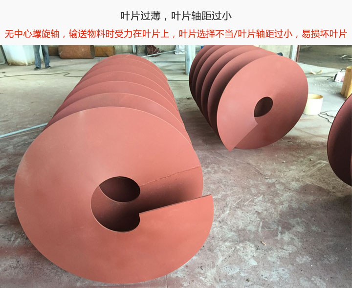 葉片軸距過小:螺旋槽體選擇不當(dāng),輸送物料的時(shí)葉片軸距過小,會造成擠壓力過大,損傷葉片;若槽體較小,同樣也會造成壓力過大,導(dǎo)致葉片損害。
