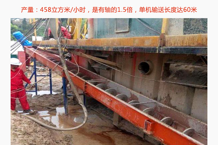 輸送量大,距離長:無軸螺旋輸送機(jī)產(chǎn)量達(dá)458立方米/小時(shí),是有軸的1.5倍,扭矩可達(dá)4000N.m,單機(jī)輸送長度達(dá)60米。