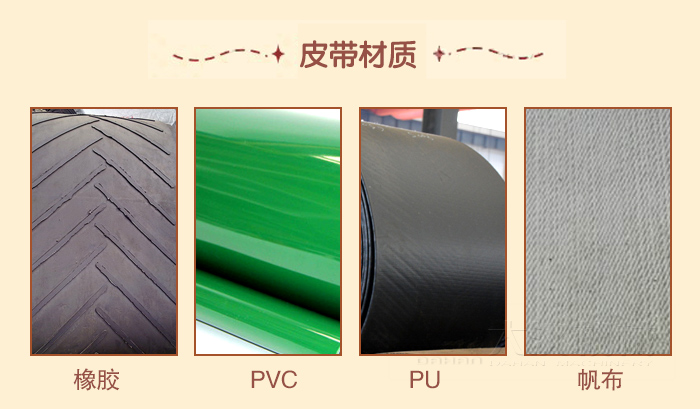 常用的膠帶輸送機可分為:普通帆布芯膠帶輸送機、鋼繩芯高強度膠帶輸機、全防爆下運膠帶輸送機、難燃型膠帶輸送機、雙速雙運膠帶輸送機、可逆移動式膠帶輸送機、耐寒膠帶輸送機等等。輸送帶有橡膠、帆布、PVC、PU等多種材質(zhì)。