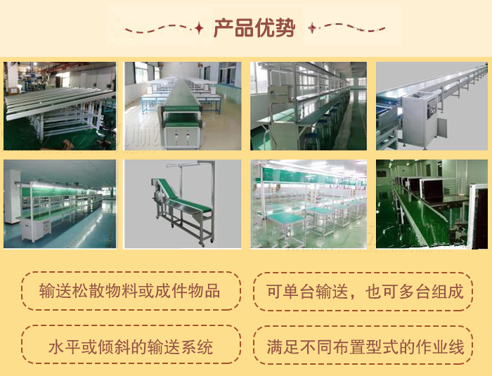 用來輸送松散物料或成件物品,根據(jù)輸送工藝要求,可以單臺輸送,也可多臺組成或與其他輸送設(shè)備組成水平或傾斜的輸送系統(tǒng),以滿足不同布置型式的作業(yè)線需要。