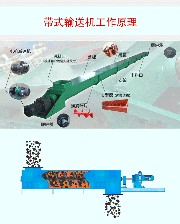 帶式螺旋輸送機(jī)也是借助螺旋軸和葉片,進(jìn)行對(duì)物料進(jìn)行推送的輸送設(shè)備。該機(jī)所選的輸送帶有普通橡膠和塑料帶兩種,可用于水平或傾斜輸送,傾斜向上輸送時(shí)不同物料所允許傾角不同。